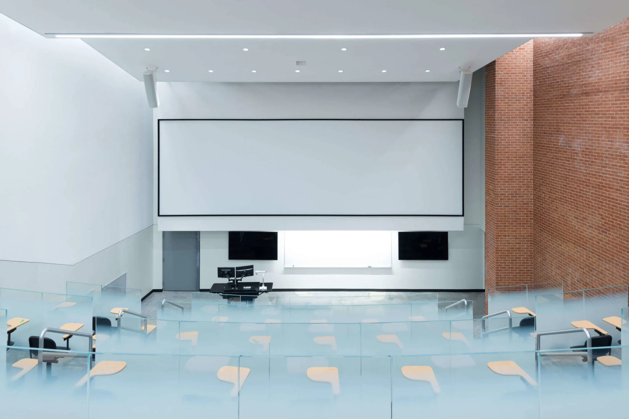 - An existing stepped lecture room was transformed into a hybrid lecture room, providing access for 60 in-person students and 40 virtual students.