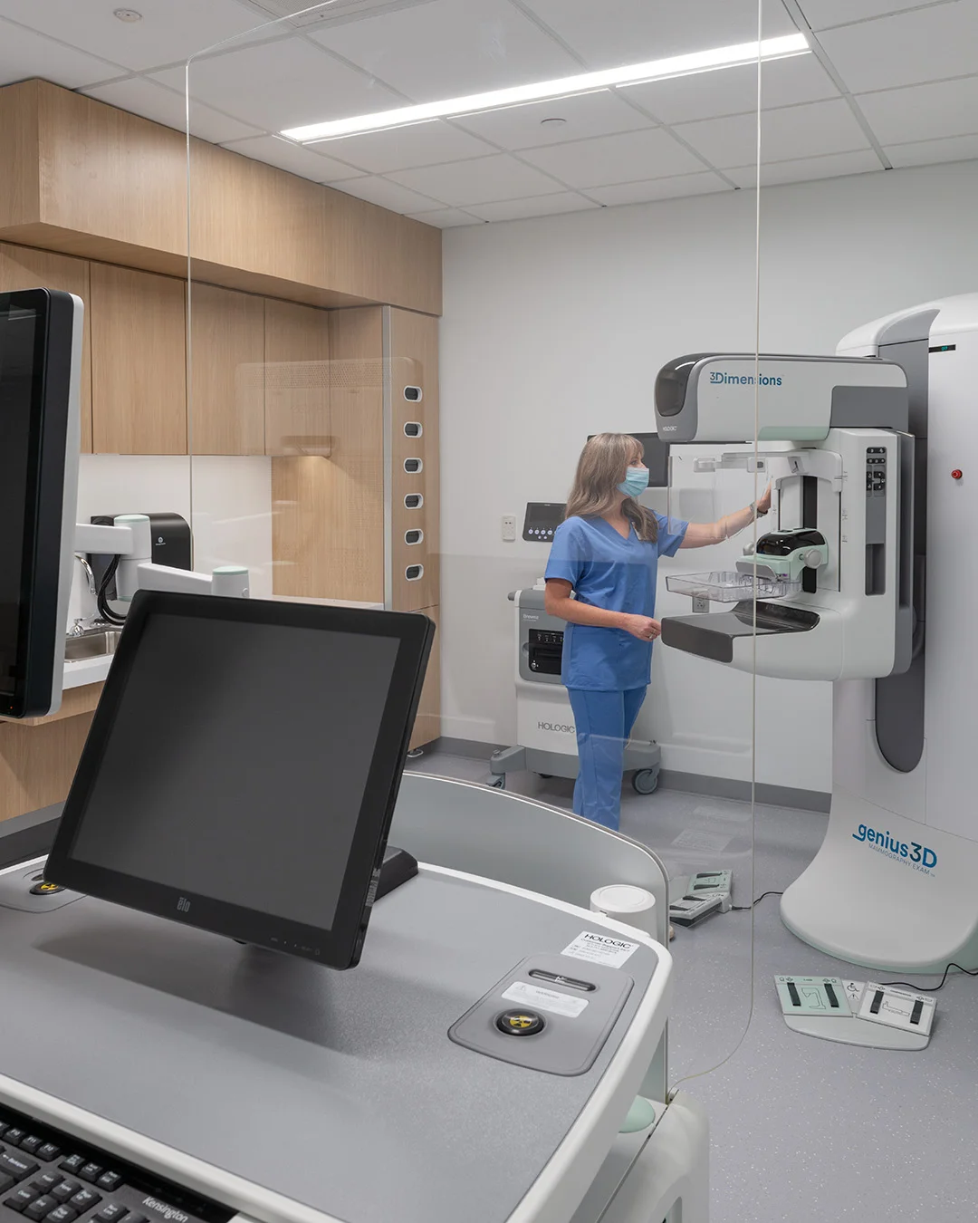 Design trends in breast imaging centers often include discreet, gowned waiting areas with private dressing rooms near the imaging rooms to maximize the efficiency of the modality rooms while also providing a quiet respite for the patient before and after the imaging procedure. However, if patient thru-put is not a priority, undressing and dressing could occur inside the imaging room. Sometimes dressing rooms can be located adjacent to the mammography room, where the patient enters the dressing room from the corridor and exits the dressing room directly into the mammography room. However, the direct-entry dressing room model requires additional radiation safety and privacy controls to make it feasible. Additionally, patient lockers should be provided so that the patient is reassured knowing that their belongings are secure during their procedure.