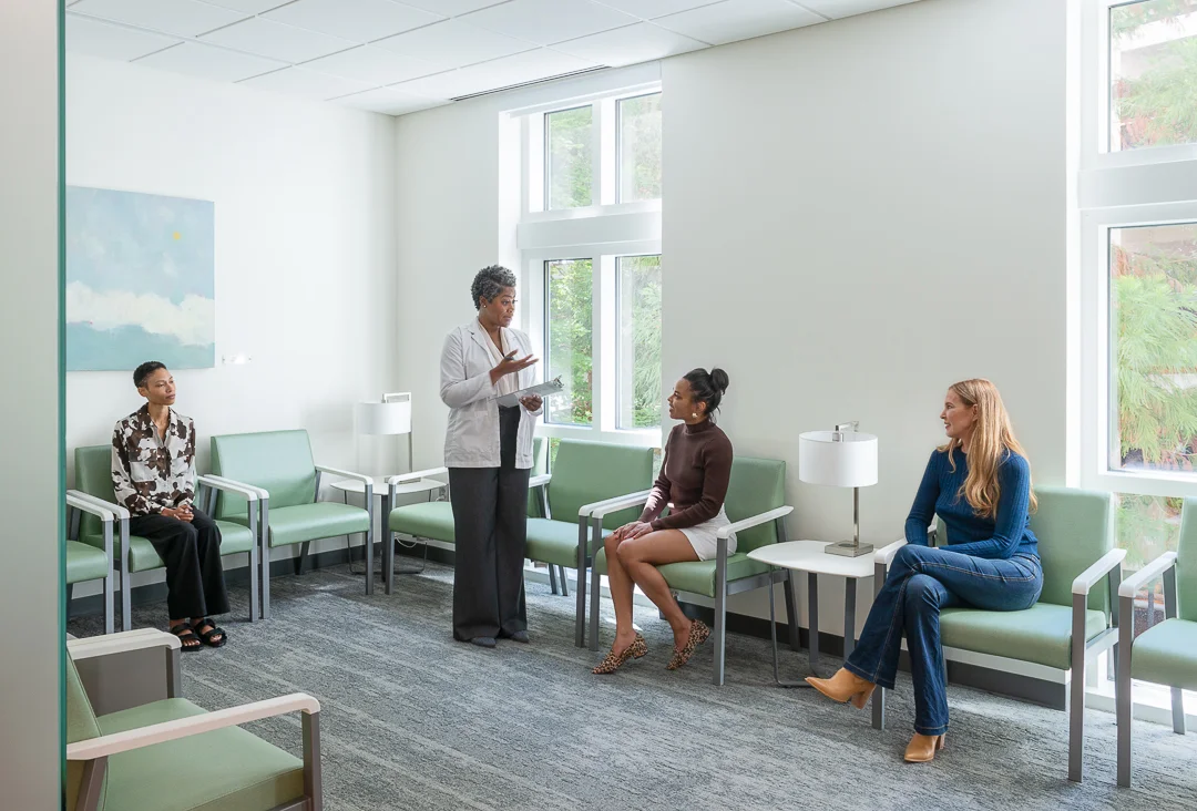 Results of evidence-based studies have concluded that healthcare spaces with views to nature and daylight reduce stress in patients, waiting spaces should take advantage of exterior vistas, like the large floor to ceiling windows at the Breast Center at the Emory Winship Cancer Institute on the Clifton campus. Where views to the outside are not immediate, an alternative is for the finish palette to reflect nature as much as possible. For example, at the Emory Winship Breast Clinic, the design of the interior lobby mimics blues and greens found in nature, and the backlit feature walls replicate the energy and movement of a grassy meadow.